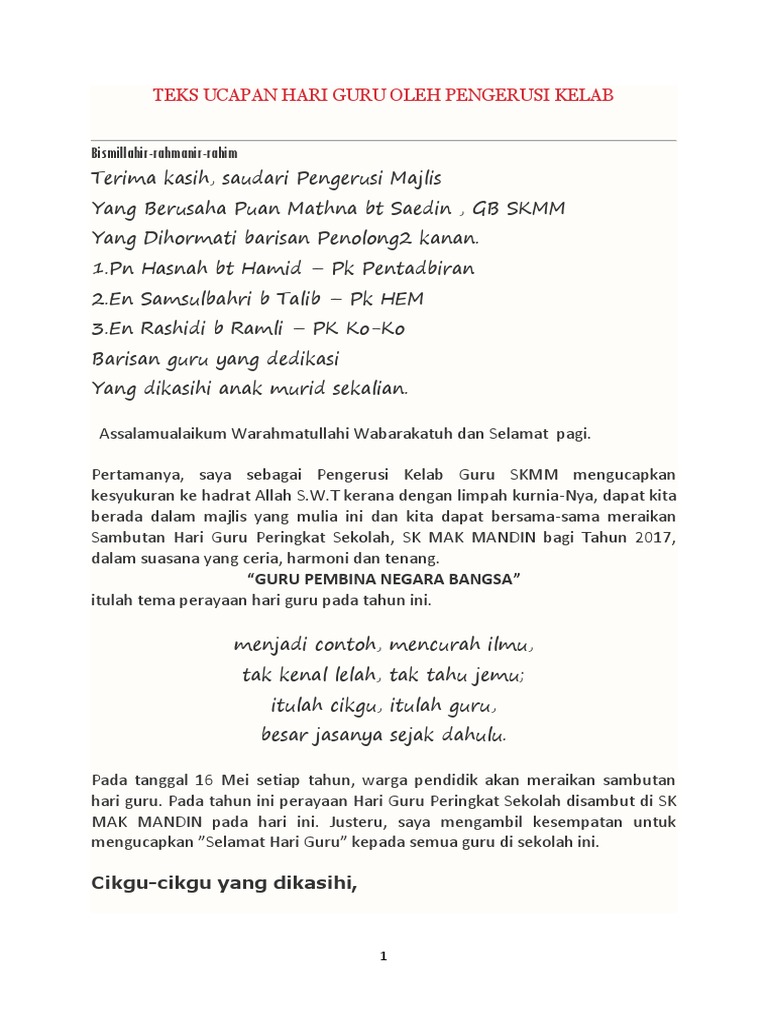 Teks Ucapan Ketua Murid Hari Guru 2017 from imgv2-1-f.scribdassets.com Jangan pernah lelah menjadi pelita bagi negeri ini. Peringatan hari guru nasional tidak bisa dilakukan seperti biasanya karena krisis pandemi. Semoga semua guru menjiwai profesyen perguruan, istiqamah mendidik dengan hati yang murni dan ikhlas dalam beramal membangun selamat hari guru. Guru merupakan salah satu orang yang paling berjasa untuk memajukan kehidupan bangsa, khususnya. Video penuh hari guru 2017, smk sagil tangkak. Majlis penutupan bulan kemerdekaan malaysia. Sk kampung kuala pajam, beranang, selangor darul ehsan. Pengumuman tarikh pembukaan semula sekolah_.
